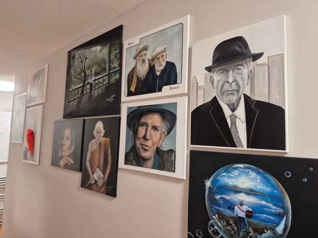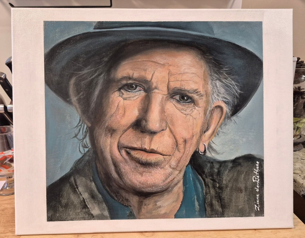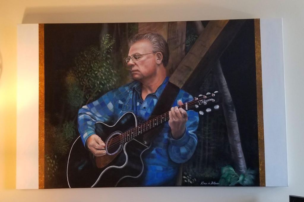 “The Musician.” Jan 1, 2024. Starting the new year with the biggest painting I’ve ever done. 48″ X 30″. Acrylic on gallery quality canvas. I’ve been using a different technique that was used by the old master artists called, “glazing.” It’s amazing how this one change keeps the colours of acrylics bright and fresh, since acrylics do tend to “dry down,” and don’t normally retain their bright colours the way oils do.