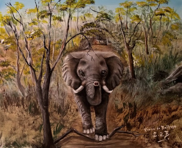 Baby Elephant showing his bravery. I love elephants. This one is 20″ X 16″, acrylic on canvas, and is FOR SALE. $350 USD plus $30 shipping.